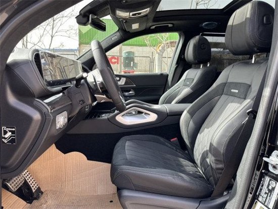 2023款奔驰GLS63后车门的做工同样很棒,后排的空间比较宽敞,后排配有两个小电扇,车顶配有一个很大的悬景天窗,后排座椅的质感同样而棒,后排配有独立的空调出风口,中间手枕的尺寸也挺大的,隐藏式的储物盒也很实用。将后排往后移动可以进入第三排,第三排的空间也比较宽敞,座椅使用电动调节位置,从后往前看视野很开阔,两块大屏让车内充满了科技感,中控面板的做工很精致,副驾驶前面设计的也很漂亮。