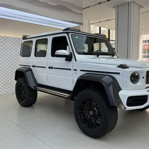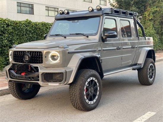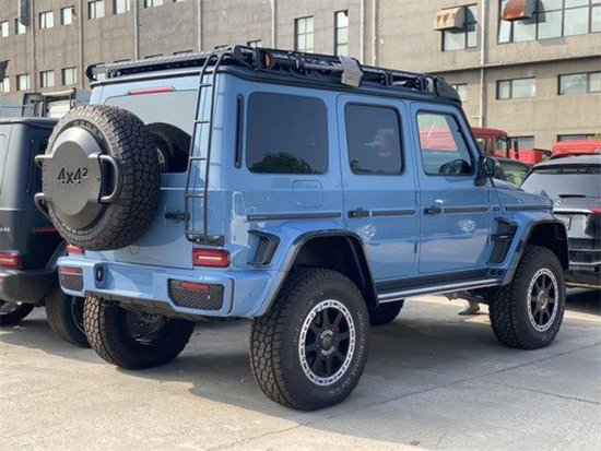 2023款奔驰G550 4x4²悬挂形成更高,配22英寸越野胎,车身侧面窗线位置靠下,车窗玻璃方正,轮眉硕大向外突出,还带有银色脚踏板。前翼子板带有V8标识,轮毂尺寸22英寸。新车接角达到了45度,离地间隙351mm,最大涉水深度910mm。