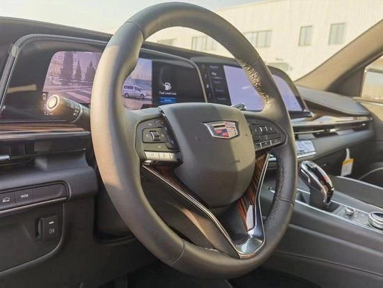2023款凯迪拉克凯雷德内饰方面,座舱内搭载错落式的双大尺寸悬浮式荧屏设计,左侧额外设置有一块小尺寸屏幕用于显示车机信息,配合环抱式的中控台面,高耸的悬浮式换挡区,精致的电子档杆,展现出不错的质感,大面积皮革缝线工艺覆盖及各种复杂的特殊面板填充,格调上也符合一款豪华品牌旗舰SUV应有水平。