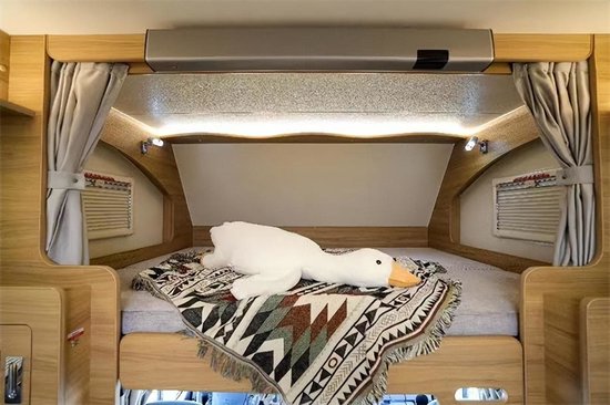 尾部休息区正好位于拓展处,拓展后床铺尺寸更宽敞。床铺尺寸为2220×1230mm,可以容纳双人休憩。床侧贴心配有车窗、床头阅读灯、充电口等,方便车主娱乐或阅读使用。顶部配有储物吊柜,方便收纳日用物品。另外床铺一侧配有穿衣镜,爱美的女主人可以轻松在车内进行穿衣搭配,镜子下方配有洗衣机,方便车主户外洗衣。