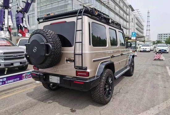 专业越野版奔驰G400D的外观与众不同,沃恩绞盘 牛栏杠配备20寸的AMG轮毂,全新的悬架,底盘升高五公分,四个微森的射灯,车顶框,行李架 费森的破冰符,袋鼠的脱困盘,这些小配都是大品牌的