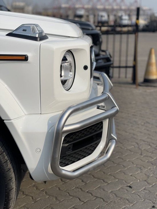 22款奔驰G63它硬朗的方盒子造型,没有多余的弧度、没有任何曲线,眼光所及满是平直锋利的线条,就连车顶上的导雨沟槽,也是沿着车顶周围一圈,贵宾购车电话:17627885113 祝经理 (微信同电话)分外焊接上去的金属槽,车门搭钮更是绝不虚心,硬挺挺地屹立在门缝之外,外凸的轮拱、造型如同 梯形的引擎盖。