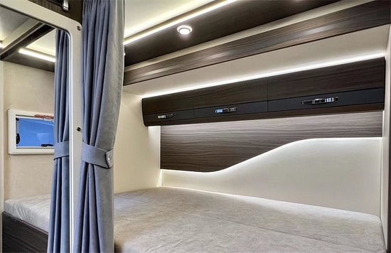 车内采用三菱的1.5P直流变频静音节能空调和伟巴斯特的进口驻车燃油暖风,还配备卡洛西进口行车冷风,为长途旅行奠定基础。会客区采用经典的四人对坐卡座样式,超大外推窗,增加了自然光照入车内的面积,座椅的上方有丰富的储物空间。升降桌降下与对坐沙发可以拼成一张1900*945的临时床位。