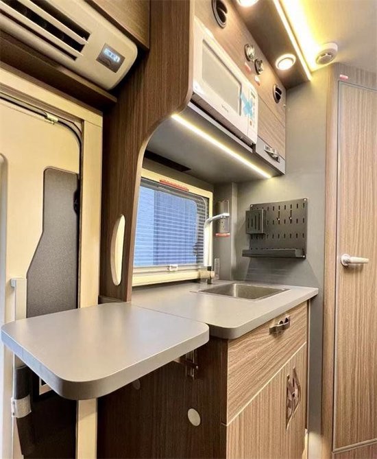 全车的长宽高为5990*2490*3180mm,同时还配置了较为丰富的生活配置,包括车身右侧的电动遮阳棚、外置翻板以及一个外置的小餐桌,里面还带有可双向抽拉的储物抽屉,平时天气好的时候也可以打开遮阳棚选择在下方做饭聚餐,享受休闲的旅居生活。