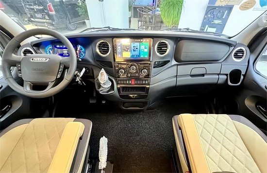 采用依维柯欧胜国六底盘,带有空气悬挂,动力部分搭载的是3.0T柴油发电机,匹配8AT手自一体变速箱,最大功率170马力,峰值扭矩400牛米,荷载6人,C证可以驾驶。电路系统配有48V 12.5度电、3500W充逆变一体机、1200W硬板太阳能,除此之外进口卡洛西行车冷暖风机、行车冷暖风+驻车燃油燃油暖风系统、三菱1.5P变频静音空调,保障在车内也能实现冬暖夏凉。