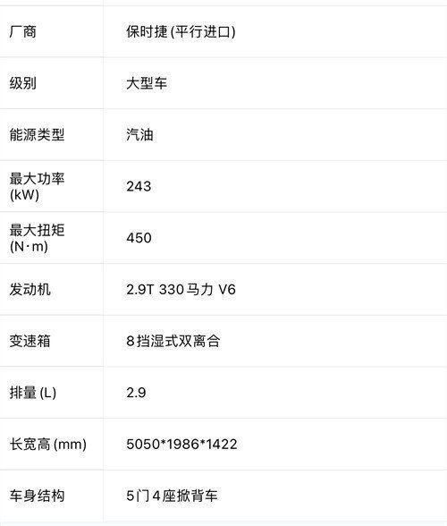 高贵而又充满激情的帕拉梅拉4S,让您拥有无与伦比的驾驶体验! 全新的帕拉梅拉4S为您呈现出一种华丽的美感,赋予其特别的路德维希·苏特夫人设计元素。强烈且优雅的车身线条,再加上几何感极强的尾部设计,让帕拉梅拉4S在外形上独树一帜。 车辆装备精良,驾乘体验从未如此舒适。它采用了先进的空气悬架技术,可以将车身高度调节在3.5英寸间,让驾驶者在不同的路况下拥有更好的操控感和舒适性。同时帕拉梅拉4S还配备了液压式卷叶式稳定器杆、前置防倾杆以及后置多连杆悬挂系统,确保所有路况下都能提供平衡、精确和灵敏的操控感。 发动机是完美之源。帕拉梅拉4S搭载了一台4.0L V8双涡轮增压发动机,最大输出力高达630匹马力。这一强大的发动机组合,加上智能化双离合器变速器,能够将性能完美地释放出来,让您尽情享受极速驾驶的快感。 豪华内饰绝对不会让你失望。帕拉梅拉4S拥有最新的嵌入式Porsche Communication Management(PCM)系统,可通过12.3英寸彩色触摸屏轻松控制音频、导航和车辆设置等。所有座位均采用高品质真皮精细缝制而成,让您在长途旅行中始终处于最佳状态。 总之,帕拉梅拉4S是一款前所未有的豪华跑车,汇聚了Porsche的先进技术、卓越工艺和独特风格。它代表着驾驶的至高境界,带给你无比畅快的驾驶体验。[更多车型配置 最新行情 分期政策,请咨询大路汽车张经理18522604299(同微信),关注朋友圈 每天更新平行进口新款车型 配置 实车照片及最新优惠政策。]