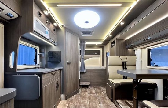 内采用三菱的1.5P直流变频静音节能空调和伟巴斯特的进口驻车燃油暖风,还配备卡洛西进口行车冷风,为长途旅行奠定基础。会客区采用经典的四人对坐卡座样式,超大外推窗,增加了自然光照入车内的面积,座椅的上方有丰富的储物空间。升降桌降下与对坐沙发可以拼成一张1900*945的临时床位。