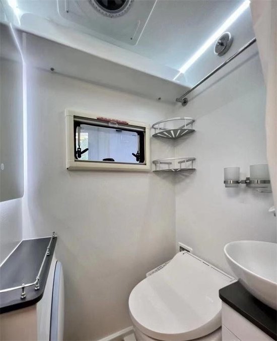 厨房区配有铁灰台面,深水槽,延伸案板,以及米家的电磁炉,上方的微波炉,可以加热食物。配合卡座后方的赛特福德152L双开门冰箱,保证旅居的食品储量。这款车还独立开发了热能回收系统,可以回收发动机余热,空调外机余热,柴油暖风余热,回收的热能可以给水箱进行加热,水不用浪费宝贵的电能再次加热可以直接用来洗澡,零下的时候可以防止水箱结冰,并且热量一直上升可以形成地暖效果,一举三得。