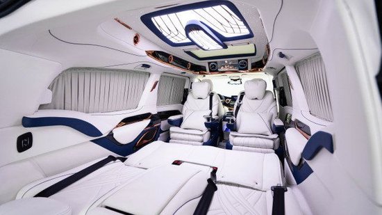 2023款奔驰V250商务车内饰方面同样做了整体的升级,中控台、方向盘、门板、车侧壁、车顶、进门的踏步整体升级包覆。正副驾驶座椅升级包覆、正副驾驶座椅中间加装车载扶手冰箱、正副驾驶座椅头顶定制宽屏车载网络电视、正副驾驶座椅椅背后方加装可伸缩的小桌板。第二排座椅升级成两个独立的航空座椅,航空座椅带多向电动调节功能,带通风、加热、按摩等舒适功能、同时航空座椅还带有选装功能,旋转之后可与第三排座椅形成对坐状态。第三排座椅升级成宽大舒适的三联排沙发床,可电动调节、前后移动,靠背可180度放平平卧。