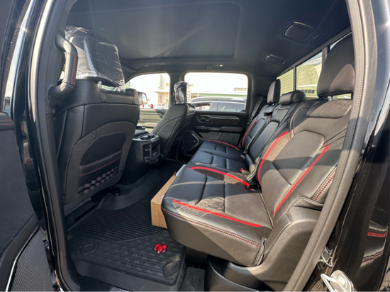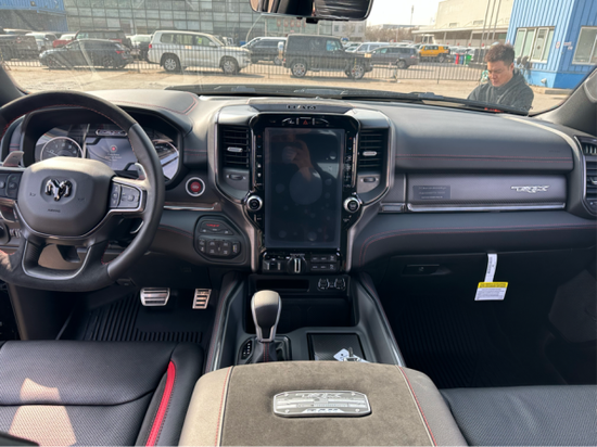 2022款道奇公羊轩尼诗猛犸象内饰部分进一步强化了其高性能版本的形象,中控台和座椅随处可见的TRX标识便是最好的例证。同时,作为道奇家族的旗舰车型,新车还配备了12英寸竖置中控屏幕,除了支持蓝牙、导航和车载Wi-Fi等常见功能,还支持Apple CarPlay和Android Auto手机映射。