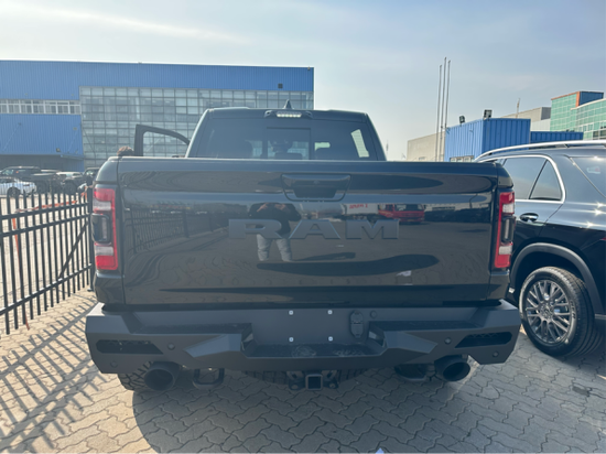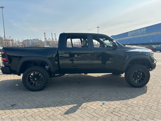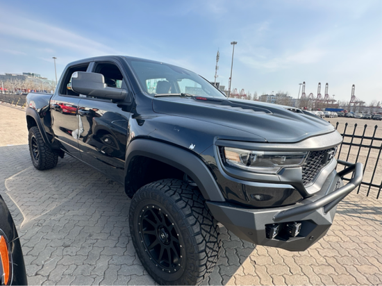 2022款道奇公羊霸王龙传承了道奇Ram家族高大威猛的造型设计,同时细节部分融入了更多高性能元素,包括经过黑化处理的前格栅,引擎盖两侧的黑色进气口,以及为了容纳巨大的机械增压器而设计的通风口等等。此外,新车还配备了视觉冲击力更强的黑色轮眉和外露式的拖车钩,看上去十分霸气。