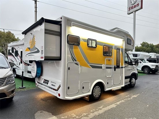 车身外侧配备有外置抽拉炉灶和外置桌板,顶部的进口菲亚玛遮阳棚完全打开后能够将其完全笼罩,带来更丰富多彩随心所欲的旅途生活。车尾的贯通式储物行李舱能够带下更多的旅途物品,能够从车内直接拿取,避免上下车取物的麻烦。车前大灯组造型独特,光线明亮均匀,后方内嵌于厢体的条形尾灯避免了行驶时受损的可能性。