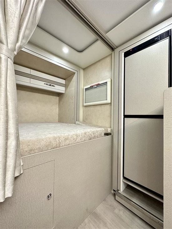 额头床内部空间达到了2210毫米*1500毫米,睡下两到三人没有问题。更大的高度再加布艺全软包,也让乘客能更方便的挪动。额头床下方采用翻折方式集成了32英寸智能电视,负责增强旅途中的娱乐体验。卡座区域采用四人对坐设计,舒适的皮质座椅为您的脊椎健康保驾护航,长途旅行也不会感到疲劳。内饰整体采用深色木纹材料,更显沉稳大气。随车的赛特福德150升房车专用冰箱也安装在卡座区域后方,便于拿取物品。