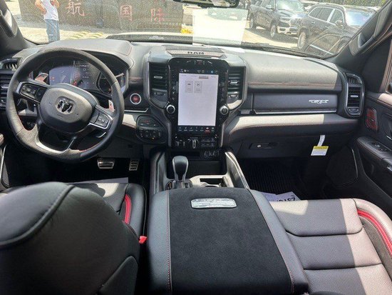 2023款道奇公羊霸王龙新车在内饰部分进一步强化了其高性能版本的形象,中控台和座椅随处可见的TRX标识便是最好的例证。同时,作为道奇家族的旗舰车型。新车还配备了12英寸竖置中控屏幕,除了支持蓝牙、导航和车载Wi-Fi等常见功能,还支持Apple CarPlay和Android Auto手机映射