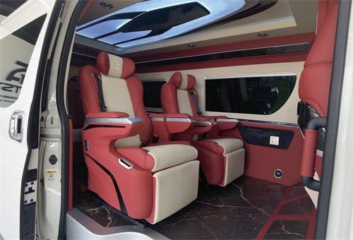 内饰:小隔断电视、车顶主灯、车内氛围灯、整车隔音/隔热、主副驾背板桌、电脑桌、热水壶、全车音响(哈曼卡顿11个杨声器+低音炮)、功放(阿尔派)、全车造型、全车包覆(Napa)、全车桃木、独立航空座椅(通风、加热、按摩、一级腿拖、无线充电)、后排沙发床、主副驾驶座椅改电动(主驾6项、副驾4项)、主副驾中央扶手冰箱、主副驾脚垫、后排座椅扶手冰箱、后排航椅触摸屏、电视顶灯控制屏、防窥玻璃膜、三门铝踏板、印花蜂窝铝地板、手动窗帘、涡轮出风口