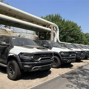 22款道奇公羊霸王龙6.2V8机械增压,710马力扭矩880,新款霸王龙家族高大威猛的造型设计,同时细节部分融入了更多高性能元素,包括经过黑化处理的前格栅,引擎盖两侧的黑色进气口,以及为了容纳巨大的机械增压器而设计的通风口等,新车还配备了视觉冲击力更强的黑色轮眉和外露式的拖车钩,看上去十分霸气。
