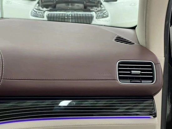 空调出风口带有原车镀铬点缀,全新升级的黑钢琴烤漆面板,带有拉丝款式黑色漆面搭配白色拉丝线条,好似流动的五线谱更能衬托迈巴赫的奢华大气,与之搭配的,还有黑钢琴漆与小牛皮双拼的方向盘,不仅美观而且握感舒适,为了彰显及处处顶级奢华的设计,就连方向盘到副驾驶前方前,后排座椅等处的安全气囊图标也从原来的黑丝塑料样式,升级为钢印热压技术制作成型,更具质感和辨识度,同色系的表台下杂物箱,细节品质感看得见,给人舒适感和奢华感。