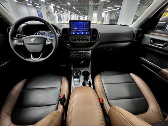 2022款福特烈马Bronco新车的内饰整体线条硬朗,造型方正,与F-150 (配置|询价)相似的内饰风格让其硬汉形象更加突出。副驾驶一侧还设计了新车车门的铭牌。在细节上,新车中央采用了一块较大尺寸的中央多媒体屏幕,多媒体屏幕上方采用了与奔驰G级 (配置|询价)相似的三把锁按键以及危险警报灯按键。两侧空调出风口采用方正的矩形设计,整体给人一种粗犷的风格。为了方便清洁,部分Bronco车型带有集成了排水孔的可冲洗橡胶地板,并采用防霉变的乙烯座椅面料。而且主控按钮均带有硅胶保护,防止泥沙和水侵入。