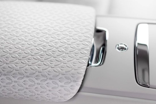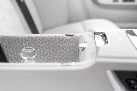 两种织料都呈现了以“欢庆女神”图案为基础的花纹。在丝绸织料中,该花纹设计较小,丝织入里,营造极为强烈的视觉效果。同时,在如扶手、中控台以及在“艺境藏珍画廊”的视线可及处,均有花纹装饰。竹制织料的绣纹则相对更大,采用室内设计常见的簇绒,因其具有弹性,且更耐磨耐触而用于下方内饰。