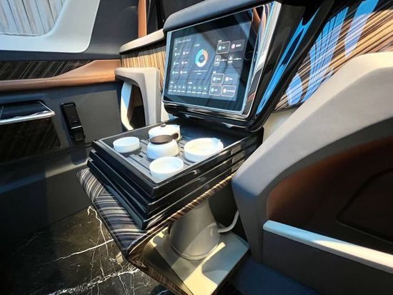 奔驰斯宾特7座报价斯宾特7座旗舰版价格,奔驰斯宾特隔断后方设计隐藏秘书椅,带电动升降功能,中间带有咖啡机,下方带有电动折叠小桌板,方便后排娱乐放松。奔驰斯宾特7座价格奔驰斯宾特7座报价图片,侧面设计二个抽拉抽屉,摆放骨瓷咖啡杯和车内物件摆放。