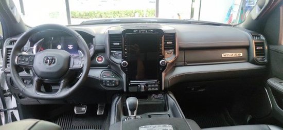 23款道奇公羊霸王龙在内饰部分进一步强化了其高性能版本的形象,中控台和座椅随处可见的TRX标识便是最好的例证。同时,作为道奇家族的旗舰车型,新车还配备了12英寸竖置中控屏幕,除了支持蓝牙、导航和车载Wi-Fi等常见功能,还支持Apple CarPlay和Android Auto手机映射。