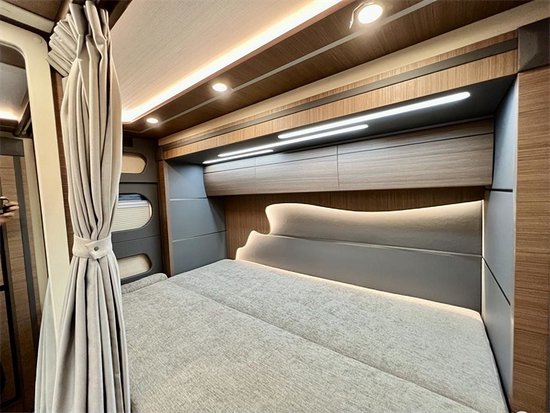 休息区位于车尾部,横置床的设计,将尾部拓展后,空间可以容纳两个人休憩。床铺周围贴心地设计了阅读灯,夜晚来到,打开小灯就可以静享阅读时光。仔细看床铺顶部,会发现顶灯造型十分具有美感,暖黄的灯带营造出满满的温馨感。