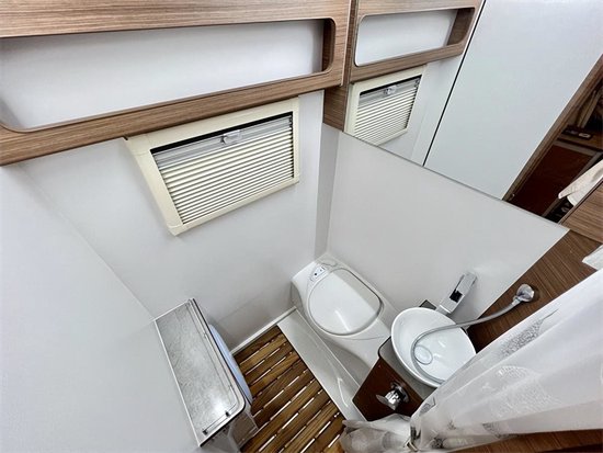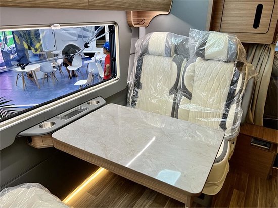 车内采用三菱的1.5P直流变频静音节能空调和伟巴斯特的进口驻车燃油暖风,方便驻车使用。还配备卡洛西进口行车冷风,增加驾驶的舒适度,为长途旅行奠定基础。车内采用中式的家居风格,棕色木纹加米色木纹的装饰,沉稳内敛符合大多数人的审美风格,会客厅部分采用的是对座式沙发卡座的设计,直径达到了1.95m,即便两个成年人对立而坐也不会碰腿。升降桌降下与对坐沙发可以拼成一张1900*945(mm)的临时床位。