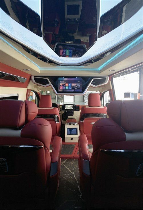 内饰:小隔断电视、车顶主灯、车内氛围灯、整车隔音/隔热、主副驾背板桌、电脑桌、热水壶、全车音响(哈曼卡顿11个杨声器+低音炮)、功放(阿尔派)、全车造型、全车包覆(Napa)、全车桃木、独立航空座椅(通风、加热、按摩、一级腿拖、无线充电)、后排沙发床、主副驾驶座椅改电动(主驾6项、副驾4项)、主副驾中央扶手冰箱、主副驾脚垫、后排座椅扶手冰箱、后排航椅触摸屏、电视顶灯控制屏、防窥玻璃膜、三门铝踏板、印花蜂窝铝地板、手动窗帘、涡轮出风口