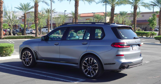 新款宝马X7 M60i侧面也是延续普通版车型设计风格,结合空气动力学原理,以修长流畅的线条打造,能够较好降低行车时风阻系数,改善驾驶体验感。车顶行李架很是抢眼,其采用镂空式结构,承载能力得到扩展,此外其还和外后视镜、门边框一道,以高亮黑材质覆盖,加之侧裙处黑化饰件,运动气息更为浓郁。22英寸五辐式轮毂尺寸突出,同时还匹配少见的蓝色四活塞刹车卡钳。