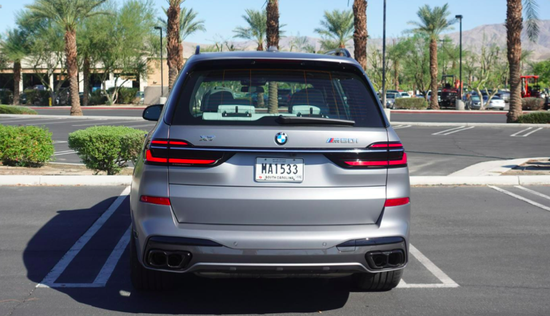 新款宝马X7 M60i尾部则简洁方正,其并未采用时下流行的贯穿式LED灯组,但样式上比较厚重硬朗,较之前灯组更加霸气。内嵌式牌照框比较别致,下包围处还配备小尺寸的扩散器装饰。其双边共计四出排气结构极富战斗感,在黑化之后更显攻击性。