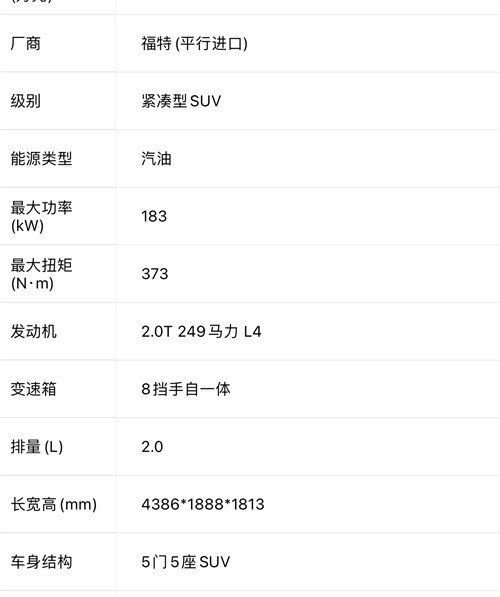 Sport 2.0T Badlands荒地版 非承载车身 8速变速箱 方向盘换档拨杆 自动启停系统 越野悬架 7种地形模式( 正常,节能,运动,雨滑,泥沟,沙子,岩石爬行) 可阻断差速器 电动助力转向 自动紧急制动防撞辅助(带行人检测) 倒车雷达 影像 营地室外照明系统(后备箱) 盲点监测 6.5英寸数字仪表板 胎压监测 移动设备的无线充电器 BO音响 9气囊 座椅加热 远程点火 旋钮档把 110V/400W电流转换器 17英寸(235/65R17全地形越野轮胎) 尺寸:Fofd Bronco sport 荒地版 长度:4386mm,高度1813mm,无镜面宽度1888mm,轴距:2670mm。[更多车型配置 最新行情 分期政策,请咨询大路汽车张经理18522604299(同微信),关注朋友圈 每天更新平行进口新款车型 配置 实车照片及最新优惠政策。]