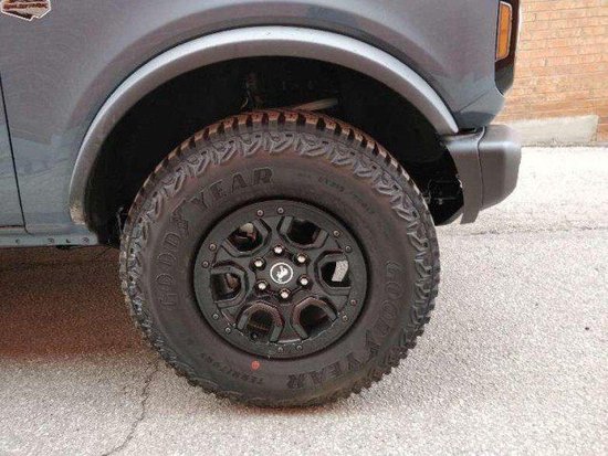 23款福特烈马Bronco还提供了16/17/18三种尺寸的轮毂可选,基础版车型为255 70/R16的全季轮胎;顶配车型预计装备315 70/R17的M/T越野轮胎。车身的离地间隙最高可达294mm,涉水深度高达850mm,通过角和离去角分别是29°和37°,数据非常可观。