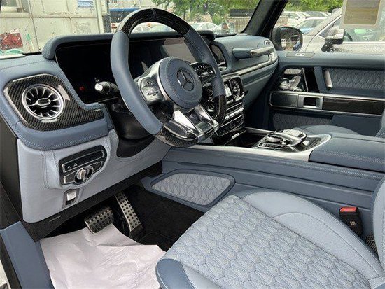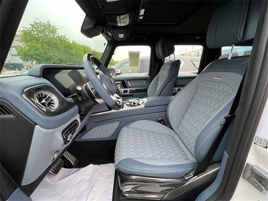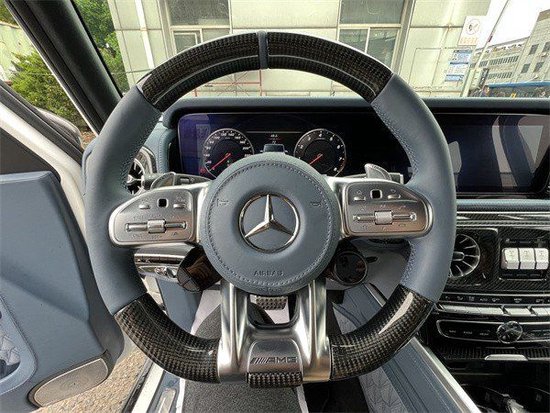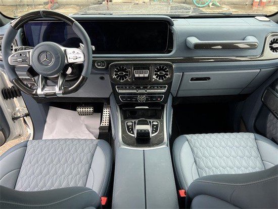奔驰G63保留了新G500 (配置|询价)的整体设计,除配色差异外,新车 还换装了全新造型的平底式AMG运动方向盘,其两侧配以打孔皮质包裹,下部镀铬装饰的造型也与新G 500明显不同,看上去十分战斗。此外,全液晶仪表盘+中控大屏的双12.3英寸屏幕设计在新车上也没有缺席,营造出了浓郁的科技感。