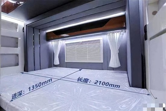 车内采用简约时尚的风格设计,特别适合中青年人群。驾驶舱上方的额头床区域,空间容积还是比较大的,可以满足两个成年人在这里休息。另外额头床配有三个外推窗,能够更好的为额头床区域进行通风和透光。在副驾驶后方则设计了小吧台,上车后可以将包包钥匙或鞋子收纳到这个位置。