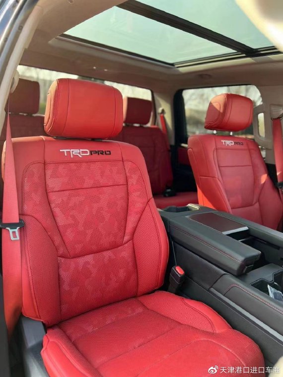 2023款丰田坦途车内后排座椅宽大,足以满足身高195cm的贵宾,第二排座椅可以完全折叠收起,为乘客提供更宽敞的腿部空间,已经达到了中大型车的水平。座椅采用真皮材质,带有TRD PRO标识,显示这是一台不一样的丰田坦途。