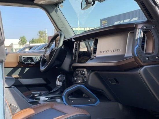 2023款福特烈马Bronco的内饰整体线条硬朗,造型方正,与F-150 (配置|询价)相似的内饰风格让其硬汉形象更加突出。副驾驶一侧还设计了新车车门的铭牌。在细节上,新车中央采用了一块较大尺寸的中央多媒体屏幕,多媒体屏幕上方采用了与奔驰G级 (配置|询价)相似的三把锁按键以及危险警报灯按键。两侧空调出风口采用方正的矩形设计,整体给人一种粗犷的风格。为了方便清洁,部分Bronco车型带有集成了排水孔的可冲洗橡胶地板,并采用防霉变的乙烯座椅面料。而且主控按钮均带有硅胶保护,防止泥沙和水侵入。