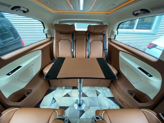 这款奔驰威霆七座商务车的地板重新铺设防滑耐磨防腐蚀的牛皮地毯,顶上再配上简单的氛围灯,营造出令人舒适的乘坐氛围。