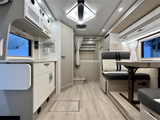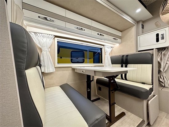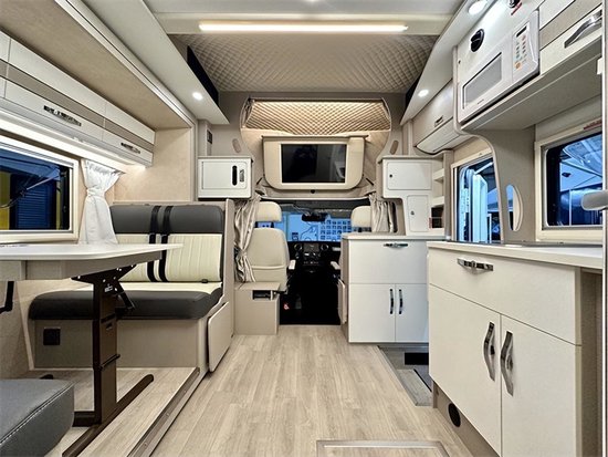 额头床内部空间达到了2210毫米*1500毫米,睡下两到三人没有问题。更大的高度再加布艺全软包,也让乘客能更方便的挪动。额头床下方采用翻折方式集成了32英寸智能电视,负责增强旅途中的娱乐体验。卡座区域采用四人对坐设计,舒适的皮质座椅为您的脊椎健康保驾护航,长途旅行也不会感到疲劳。内饰整体采用深色木纹材料,更显沉稳大气。随车的赛特福德150升房车专用冰箱也安装在卡座区域后方,便于拿取物品。