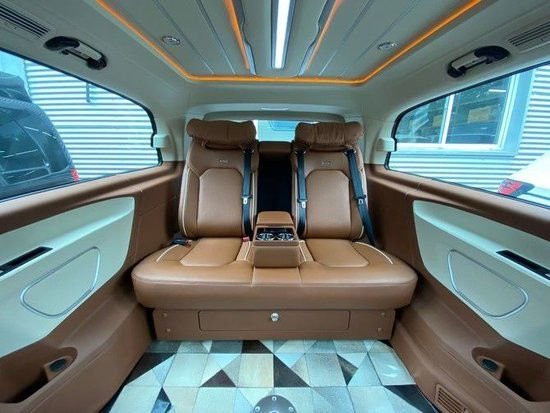 这款奔驰威霆七座商务车的地板重新铺设防滑耐磨防腐蚀的牛皮地毯,顶上再配上简单的氛围灯,营造出令人舒适的乘坐氛围。