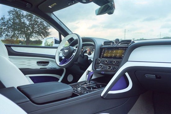 宾利添越 (配置|询价)EWB采用三层Snow Quartz车漆,与黑色装饰形成鲜明对比,同时搭配22英寸十辐轮圈。为与拍卖会形成呼应,换挡杆、座椅、缝线等均采用紫色主题。13810013306郭先生
