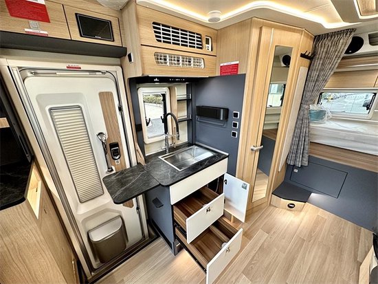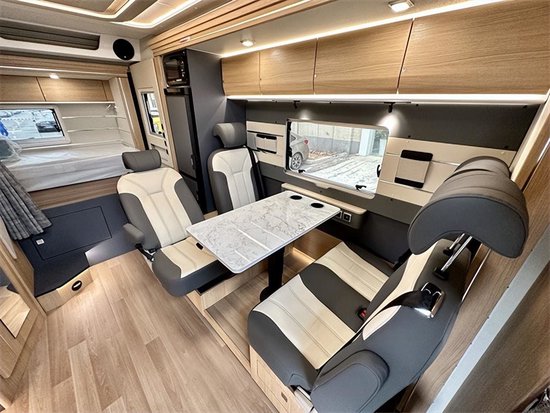 新内饰采用澳洲胡桃风格的设计,低调而奢华,非常有质感,给房车旅行生活提高了品质,还可以选装马拉加樱桃木风格内饰,车内布局从前往后依次为额头休息区、会客区+厨卫区,后方是尾部休息区,车内高度更是达到了2米。这个双人对坐的会客区小编非常喜欢,满足4人对坐的同时,其中一个座椅可以放躺。旁边墙壁上电源接口和USB接口非常多能够满足多个设备同时使用。