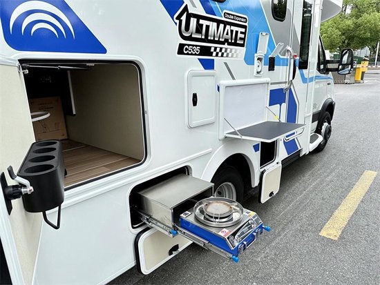 厨房区域台面设有翻折式延长桌板以及三合一水龙头不仅可以增加操作空间还能满足直饮水、冷水以及热水多种需要让你烹饪更加简单方便。台面下方配备储物柜可以放置厨具,容量充足且方便拿取。厨房对面配备了148L房车专用空调以及微波炉,让您在旅途中随时都能吃到新鲜热腾腾的食物。