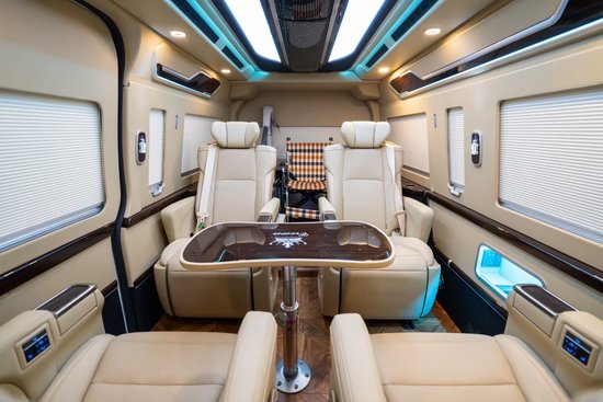 丰田海狮整车(东方众威原创)升级了加强型的隔音隔热处理,车内带空气净化系统,无线充电系统。在进门侧加装了氧化铝脚踏带迎宾灯的,(东方众威原创)整车都是采用纳帕级皮质进行包覆的,侧壁桃木装饰,手动百褶窗帘,后舱暖风系统,最后说说棚顶灯光,这个有智能触摸控制系统。灯光超级棒。