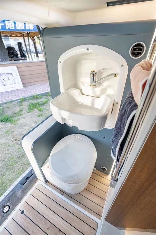 车尾最后部是后置卫生间,瑞弗启界X500是首款后置卫生间布局的房车,配备房车专用马桶,折叠式洗脸盆和户外淋浴系统,方便我们在户外时临时用来冲个脚等应急。这款瑞弗启界X500的主要定位是商旅车型,外观沉稳大气,凸显着浓浓的商务气息。内饰做工精致,显得更有格调,提升了露营生活的品质。