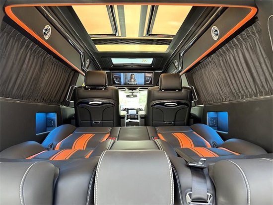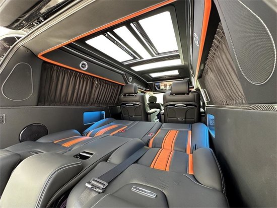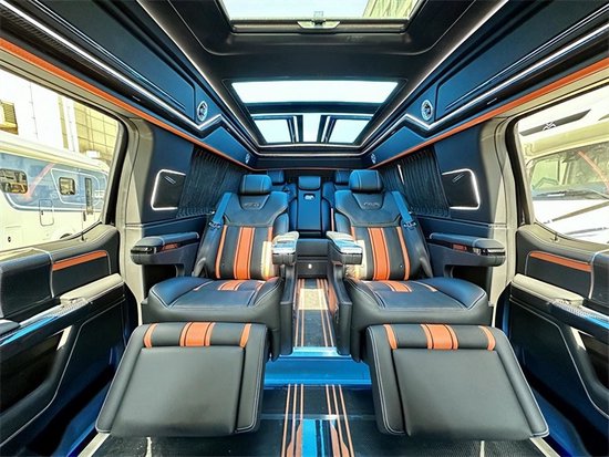 第二排搭载的是两张航空头等舱座椅,拥有12项电动调节,通风加热按摩脚托腰托甚至是座椅上下调节都应有尽有,地板部分采用的是碳纤维风格地板,档次十足,顶部有一个定制的顶灯,它有三款颜色可以随意的切换,适用于不同的车内场景,展现出不同的氛围感。车内总体空间感十分宽敞,适用于商务接待或家庭旅行。