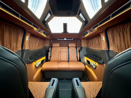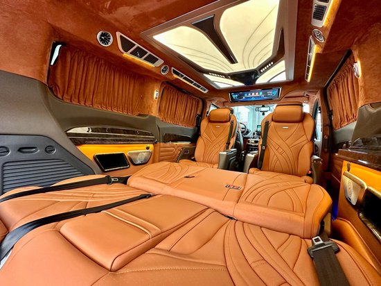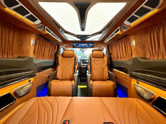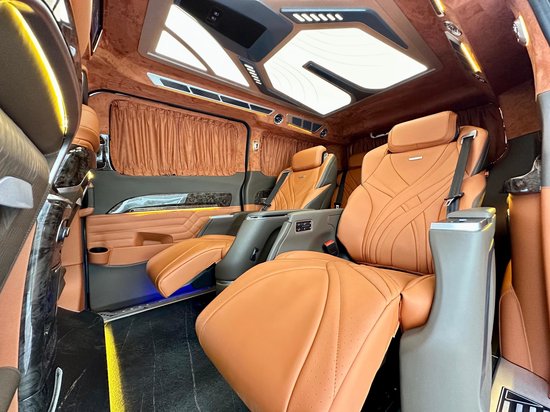 驾驶舱采用NAPPA头层牛皮+碳纤维搭配双拼,仪表台采用的是法式双缝线的设计。中央扶手带有制冷冰箱,支持零下12度到10 度的温度调节,夏天可以随时有冷饮,一些食物也可以临时冷鲜储存。全隐私的双层窗帘。影音系统搭载VVCAR 9.1声道立体环绕音响,打造身临其境的视听环境。