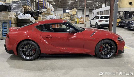 侧面可以看到丰田GR SUPRA搭载的熏黑十辐轮毂,搭配内部的红色卡钳。当然作为追求性能的跑车,驾驶舱位于车辆的偏后部位,这在运动型车上也极为常见,长车头、短车尾的设计更易于达成前后重量平衡的需求。