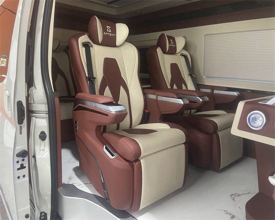 后排乘坐舱采用DVD智能24寸显示器、卡拉OK系统、折叠桌、内饰把手实木、空调出风口实木、全皮软包内饰顶棚、两侧航空灯、两侧窗帘、两侧装饰框及中门尾门、全新设计艺术办公桌(纸巾盒、杯架、抽屉)、220V电源、四张埃尔法样式航空座椅电动前后、电动靠背、脚托、加热、按摩、通风、模具塑料真皮扶