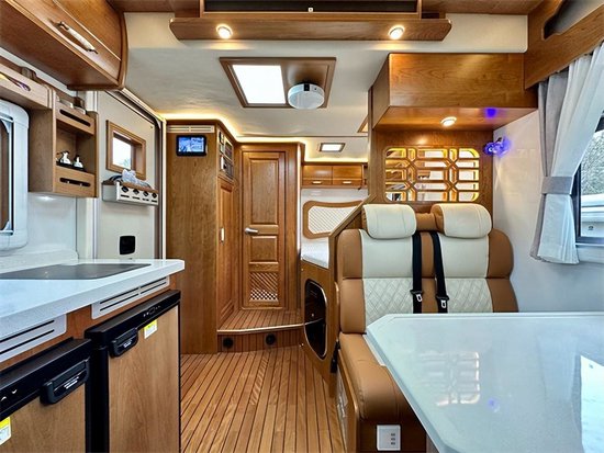 下面我们看看室内的空间分布吧!车内采用实木风格家具+游艇级防水抽木地板,车门为中开门设计,左侧为休息和卫浴区域,右侧为会客和厨房区; 箱体内部和驾驶室是相互贯通,可以防止紧急情况的发生,前部设计有投影幕布,并且搭配了G9S投影仪+JBL音响系统,让你在房车中也能体验出电影院的感觉。