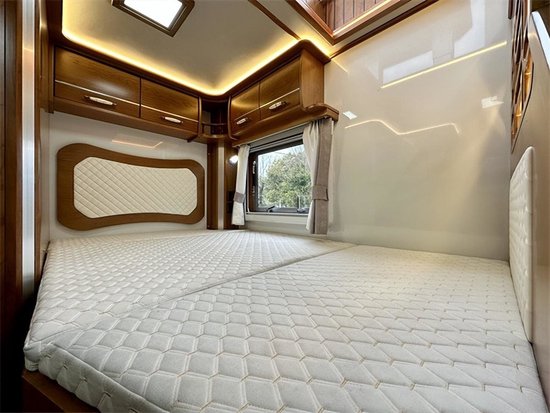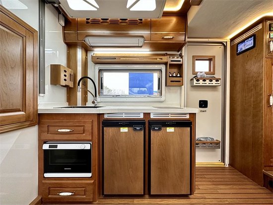 厨房区实木组合式橱柜采用分区域布局设计,不同的功能相互呼应的同时也让做饭井然有序,其它方面配备触摸式集中控制系统+机械式翘板开关、液晶电视、小米盒子、日本YAMAHA八喇叭音响系统(带低音炮)、抽油烟机、微波炉、西门子电磁炉、152L赛特福德房车专用冰箱、大宇3kg洗衣机、特鲁马燃油暖风热水一体机、四路监控、一氧化碳/烟雾报警器等。室内多个220V、12V电源插座及USB充电接口可满足日常充电需求。